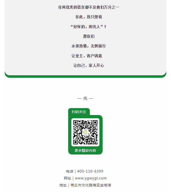 陽(yáng)光物業(yè)成立于2003年5月,專注物業(yè)服務(wù)行業(yè)20余載,陽(yáng)光物業(yè)現(xiàn)為河南省物業(yè)管理協(xié)會(huì)副會(huì)長(zhǎng)單位、商丘市物業(yè)管理協(xié)會(huì)副會(huì)長(zhǎng)單位,公司注冊(cè)資金1020萬(wàn)元,陽(yáng)光物業(yè)連續(xù)多年被河南省及商丘市評(píng)為先進(jìn)企業(yè)、優(yōu)秀企業(yè)。